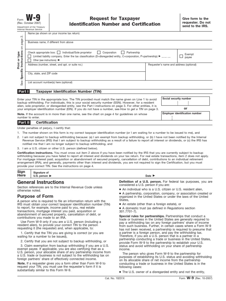 W(9) IRS FORM Withholding Tax Social Security Number Free 30day